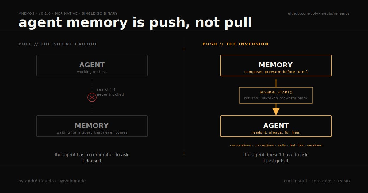 Mnemos starts from the opposite assumption: the agent will not call your memory tool, so you have to push memory at the one moment the agent is guaranteed to look.