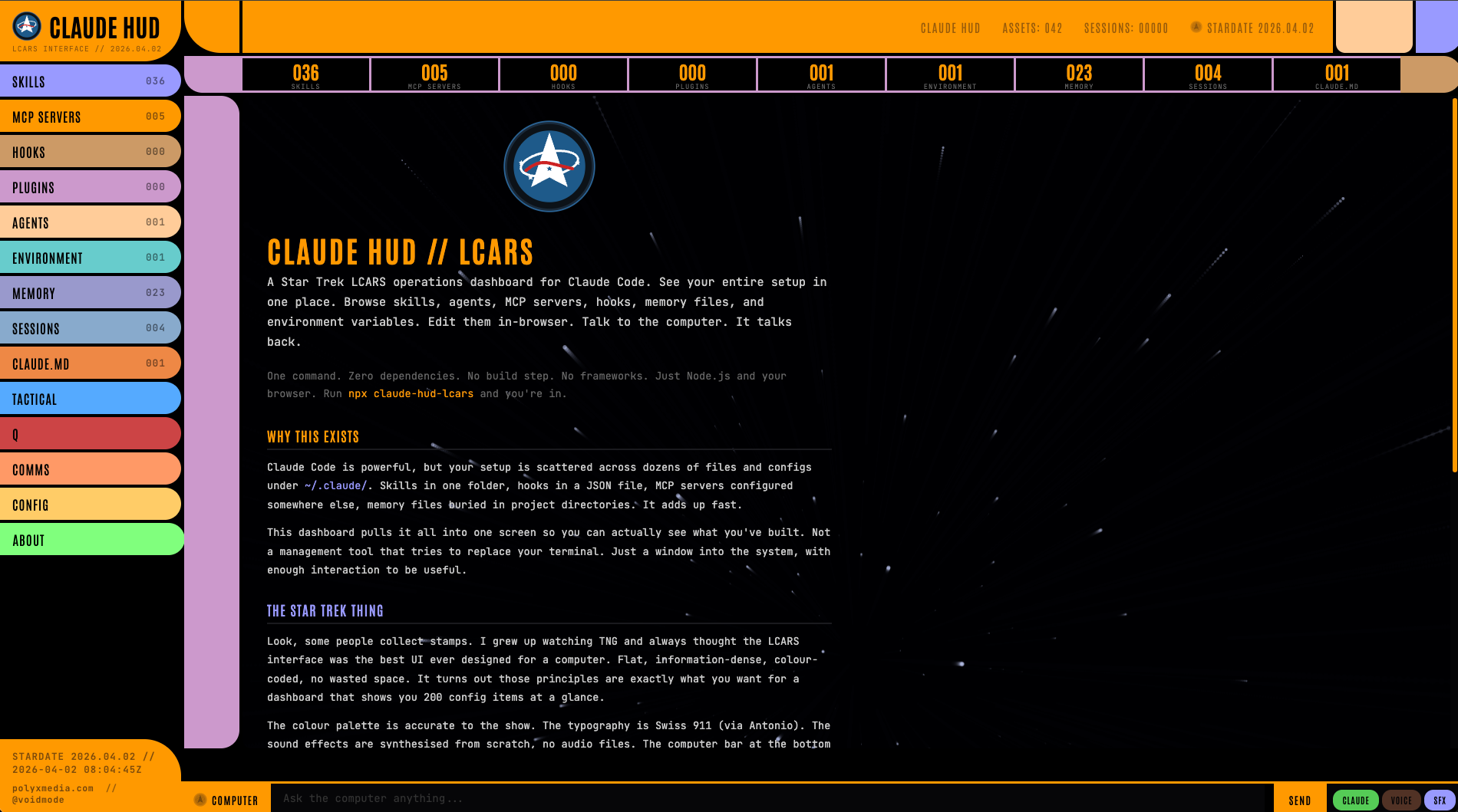 The repo is at github.com/polyxmedia/claude-hud-lcars. Star it, fork it, and if Q roasts your setup particularly hard I want to hear about it.